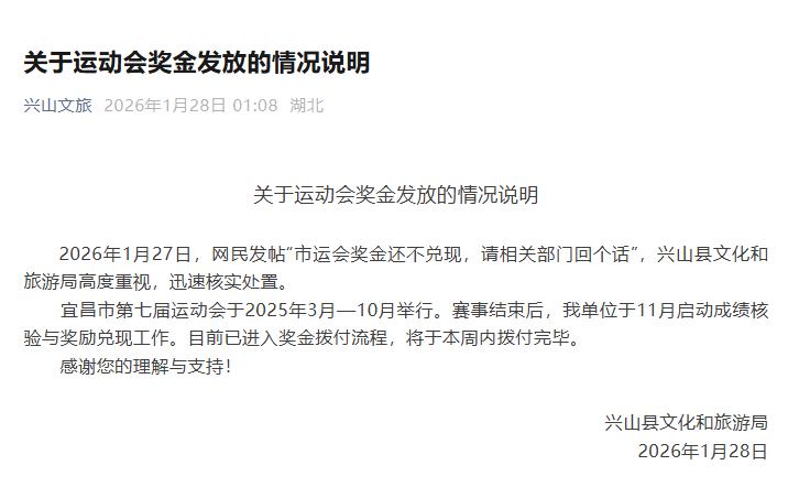 新京报1月28日,湖北省兴山县文化和旅游局发布体育赛事奖金发放情况说明。内容如下。 2026年1月27日,有网友发帖称:“市级比赛奖金尚未兑换成现金,请向相关部门回复。”兴山县文化和旅游局高度重视此事,迅速核实并采取行动。宜昌市第七届体育邀请赛将于2025年3月至10月举行。比赛结束后,兴山县文化和旅游局于11月开始核实成绩并兑奖。债券支付流程已经开始,预计将于本周晚些时候支付。近日,有多位湖北省宜昌市兴山县的运动员发帖称,他们去年在宜昌市第七届体育邀请赛上获得奖牌后,仍然没有收到相应的奖金。这起事件引人关注引起注意。编辑 申真