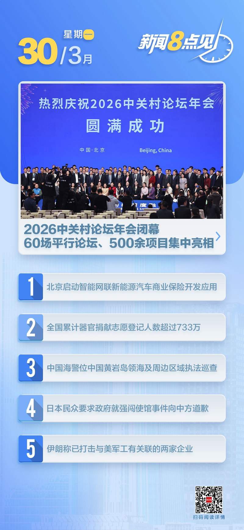 【时事新闻】全国累计登记自愿器官捐献者超过733万人。 29日在山东省济南市举行的“生命曙光——2026全国器官捐献纪念暨推介活动”上,记者获悉,全国累计登记自愿器官捐献人数已突破733万人。登记人数已超过733万人,公民死亡后器官捐献超过6.5万例。已捐献超过20万个器官、12万个角膜和超过6.9万具遗体。超过20万名器官衰竭患者的生命被挽救,10万人得以分娩。 (新华社)阅读全文>>>南部战区正在黄岩岛领海、空域及周边地区组织战备巡逻。 3月29日,解放军南部战区组织召开海军、空军在中国黄岩岛领海空域及周边海空域开展战备巡逻。黄岩岛是中国固有领土。 3月以来,战区海空军加强对黄岩岛领海周边海空域的巡逻监视,依法依规开展监测监视、警告驱离,有力有效应对各种违法挑衅行为,坚决维护国家主权安全,坚决维护南海和平稳定。 (南部战区)中国海警在中国黄岩岛及其周边领海开展巡查。 3月29日,中国海警在中国黄岩岛及其周边领海开展警务检查。硅3月以来,中国海警持续加强黄岩岛及其周边领海警力巡查,依法依规查处违法船舶,进一步加强相关海域管控,坚决维护国家领土主权和海洋权益。 (中国海警办)【本地】中关村论坛2026闭幕,60场平行论坛、500多个项目公布。 2026年3月29日,中关村论坛2026年年会圆满结束后,嘉宾与工作人员合影留念。新京报门将王飞供图 2026中关村论坛年会于3月29日在北京落下帷幕。今年的论坛,60场平行论坛中过半聚焦未来产业,500多个优质项目亮相并落地实施等成果智能制造与智能制造。 (新京报)标题>>>中关村论坛年会成为可穿戴骨科机器人远程仿真演示新技术试验场。新京报记者 蒲峰 摄 3月29日,2026中关村论坛年会主要成果专题新闻发布会举行。大会宣布签署21项具有国际影响的重大科技成果和一系列卓有成效的政策,以及一系列国内外合作协议和重大项目。当他回顾论坛年会时,与会者最深的感触是人工智能正在为千行百业提供动力,使论坛成为新技术的试验场。 (新京报)阅读全文>>>北京开始开展智能网联新能源汽车商业保险开发和运用。记者l29日从北京市金融监管局获悉,北京在智能网联新能源汽车商业保险产品开发应用方面处于全国领先。 (央视新闻)阅读全文>>>京津冀三省启动海葬遗体,近4万死者选择在北京海葬。 3月29日,2026年京津冀海洋遗骸埋葬活动在天津渤海湾隆重举行。照片中,一家人将花瓣扔进海里。新京报记者 王桂斌 摄 3月29日,由京津冀民政部门联合主办的京津冀2026海葬开幕活动在天津渤海湾隆重举行。自1994年中国政府主动推动遗骸海葬以来,始终坚持殡葬最初的公益宗旨30多年来,我们不断优化海葬服务。截至目前,已累计组织海上集体葬礼950场,安葬死者骨灰约4万枚,为12.7万名遇难者亲属提供追悼会。公众参与度逐年提高,社会反响也很好。 (北京报)阅读全文>>> 【社会】黑龙江省海林市一栋楼房倒塌,两人获救。 3月29日午夜时分,黑龙江省海林市海林镇一栋楼房局部倒塌,造成9人被困。据记者向有关部门询问,目前已有两人获救,目前情况不明。 (央视新闻) 【财经】王星星:下个月的比赛,很多机器人都能跑得比人快。 29/2026中国国际在线媒体论坛上,玉树科技创始人王星星预言:“在机器人市场下个月在北京举行的马拉松比赛中,很多机器人有可能跑得比人类快,不到一个小时就能跑完半程马拉松。” 抽签仪式上,世界排名第一的男单选手王秋琴将在首轮对阵罗马尼亚选手爱德华·约内斯库,而世界排名第一的女单选手孙颖莎将在首轮对阵中华台北选手李玉成。(新华社)【国际】日本人已经展示了要求高光市政府就闯入使馆事件向中方道歉。数千名日本人29日在东京新宿再次举行集会,抗议首相高市早苗上任以来的一系列危险政策措施,并呼吁高山市对自卫队成员闯入中国驻日本大使馆事件作出适当反应,立即向中方道歉。中东局势外长会议在巴基斯坦举行。巴基斯坦、土耳其、埃及、沙特外长会议29日在巴基斯坦首都伊斯兰堡开幕。会议将讨论如何缓和中东局势、促进地区稳定。 (新华社)伊朗宣布袭击了两家与美国军工相关的公司。包括法尔斯通讯社在内的多家伊朗媒体29日报道称,伊朗伊斯兰革命卫队发射导弹和无人机,袭击了位于中东的两家美国军事和航天公司。 (新华社)编辑贾聪聪孙林志遮瑕王欣