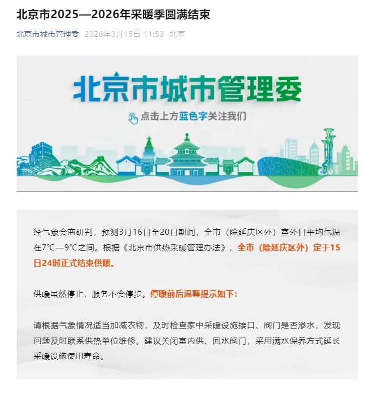 新京报讯 据北京市城管委消息,经天气会商判断,预计3月16日至20日全市(不含延庆区)室外日平均气温在7℃至9℃之间。根据《北京市供热管理办法》,全市(不含延庆区)将于15日24:00正式结束供暖。供暖将停止,但服务不会。以下是停止加热之前和之后应采取的预防措施。总结一下气候条件下的基本操作方法,验证连接和设备加热过程中的阀门,并在遇到问题时对设备进行加热和修复。为了延长您的供暖设备的使用寿命,我们建议关闭内部供水和回水阀门并进行维护,完成供水。陈艳婷编辑