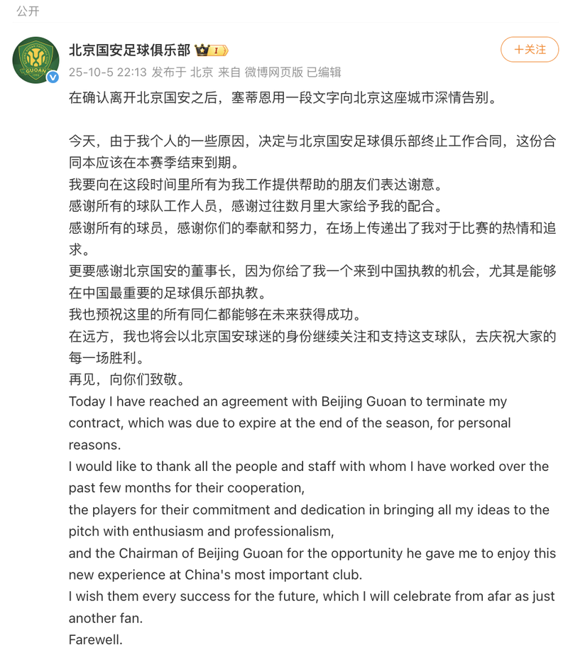 根据足球俱乐部的说法,@Beijing Guaan北京新闻说,在确认郭安在北京留下的北京之后,向北京市的告别。今天,由于某些个人原因,我决定与北京GUA Ann Football Club完成我的雇用合同,该俱乐部本来应该在本赛季结束时到期。在这段时间里,我要感谢所有帮助我的朋友。我们要感谢团队的所有员工,并感谢您最近几个月的合作。感谢所有球员。感谢您的奉献精神和努力,并分享我的热情,并在球场上寻找游戏。我要感谢北京关的总统。这是因为它使我有机会来中国参加我的教练,尤其是在中国最重要的足球俱乐部。我也希望我的所有同事将来都取得了成功。在远处,我将注意这支球队,我将作为B中的Guania的狂热者支持它埃伊(Eijing)和我将庆祝所有人的所有胜利。再见,请表示敬意。编辑Mao Tianyu