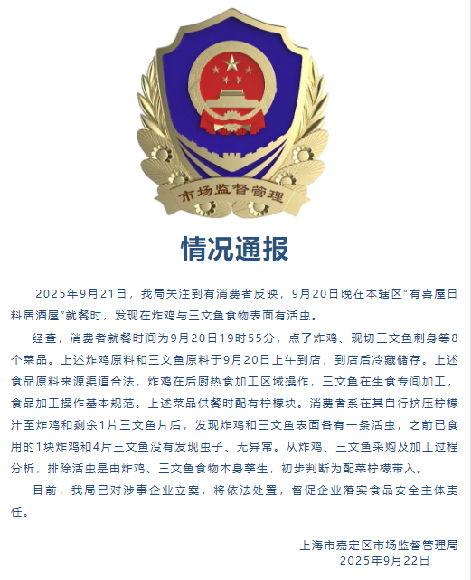 北京新闻于9月22日,吉丁地区地区市场监督和管理部上海发布了一份国家报告,其中包含以下信息:2025年9月21日,我们的车站发现,当我们吃了“ Yoxiiwu Izakiya的日本食品”时,发现鸡在9月20日晚上出现在鸡肉晚上。调查后,消费者的食物时间是9月20日晚上7:55,并订购了八种菜,包括最近切鲑鱼的炸鸡和生鱼片。炸鸡成分和以前的鲑鱼成分于9月20日上午到达商店,并在抵达时被冷藏并储存。先前食品成分的调味料通道是合法的,炸鸡在热食品加工区进行操作,鲑鱼在生食室加工,而食品加工操作则是基本标准。先前的菜肴配柠檬块。消费者收紧了油炸ocke的柠檬汁N和剩下的鲑鱼片,他发现炸鸡和鲑鱼的表面上有活昆虫。其中一只炸鸡在以前吃的四种鲑鱼中没有昆虫或异常。对鸡肉和油炸鲑鱼的采集和加工的分析不包括从炸鸡和鲑鱼食品本身中传播出来的活昆虫,最初确定驻军是带柠檬的。目前,我们的办公室正在针对所涉公司提出要求,并将根据敦促该公司履行其主要粮食安全责任的法律处理。编辑Mao Tianyu