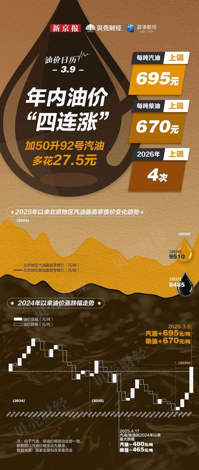 据国家发改委消息,3月9日午夜起,国内汽油、柴油(标准品)价格每吨分别上涨695元、670元。涨价方面,92号汽油、95号汽油、0.0号柴油每升价格分别上涨0.55元、0.58元、0.57元。 2026年成品油价格调整将呈现“4涨、0降、1滞”的格局。国内成品油零售价格连续第四次上涨。这是今年第五次调价,也是近四年来涨幅最大的一次。今年国内汽柴油价格累计上涨1160元,即每吨1120元。北京汽油最高零售价格为9510元/吨,柴油最高零售价格为8485元/吨。