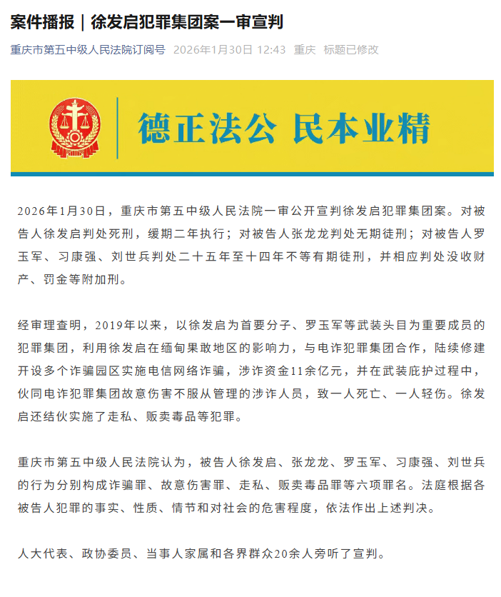 新京报讯 据重庆市第五中级人民法院订阅号显示,2026年1月30日,重庆市第五中级人民法院对徐发奇犯罪团伙案一审作出公开宣判。被告人徐发奇被判处死刑,缓期二年执行。被告人张龙龙被判处无期徒刑。被告人罗玉军、奚康强、刘世兵分别被判处有期徒刑二十五年以上十四年以下,并处没收财产、罚金等刑罚。审判发现,2019年以来,以徐发奇为策划、罗玉军等武装头目为重要成员的犯罪集团,利用徐发奇在缅甸果敢地区的影响力,与电子诈骗犯罪组织勾结,陆续建设、开设多个诈骗园区,实施电信网络诈骗,涉案诈骗资金11亿多元。我在武装保护过程中,我们与电信诈骗犯罪集团合作,对不配合的诈骗分子进行故意伤害,造成一人死亡、轻伤。徐发奇还组织实施走私、贩毒等犯罪活动。重庆市第五中级人民法院判决徐发奇、张龙龙、罗玉军、奚康强、刘世兵的行为分别构成诈骗罪、故意伤害罪、走私罪、贩卖毒品罪等六项罪。法院根据各被告人犯罪的事实、性质、情节以及社会危害程度,依法作出上述处罚。全国人大代表、政协委员、当事人家属和社会各界人士20余人旁听了宣判。编辑 申真